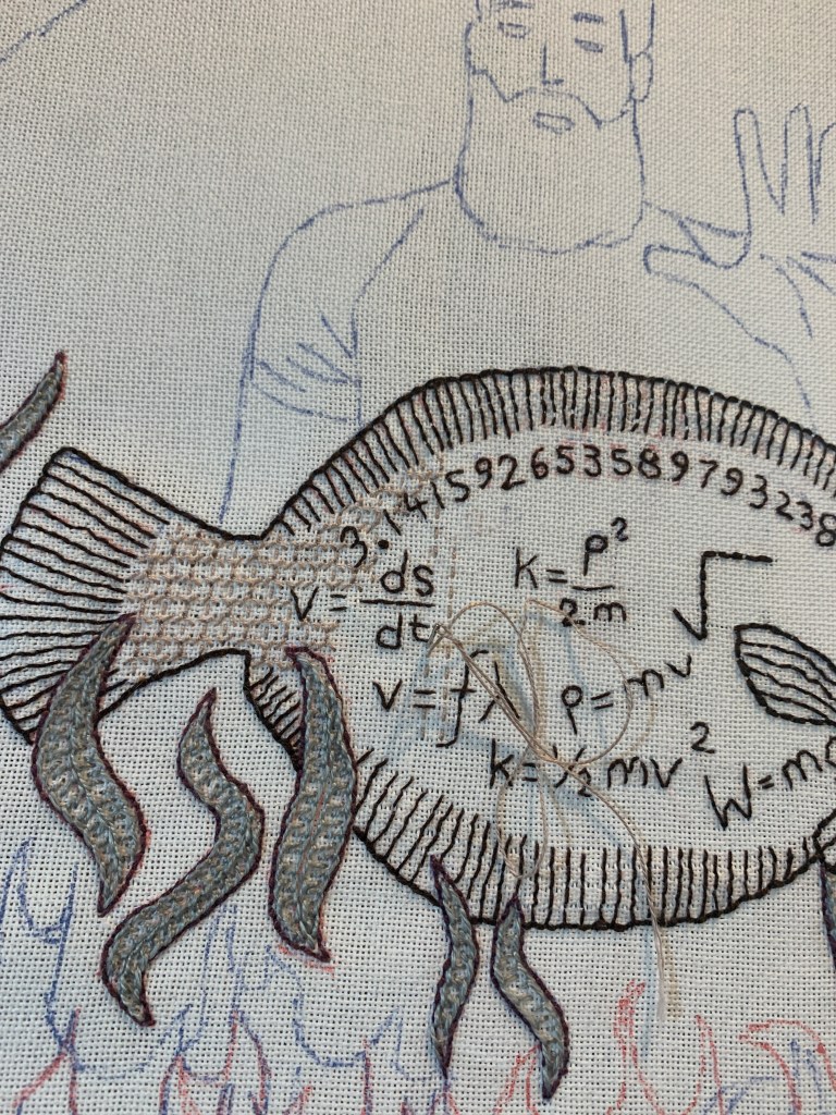 An Irish folk tale. The poet waited for years by the well to catch and eat the fish of knowledge. Eventually he caught the fish and gave it to Finn to cook. Whilst Finn was cooking the fish, he burned his thumb. He put the burned thumb in his mouth and was immediately filled with knowledge. The poet said that the knowledge was destined for Finn and urged him to eat the rest of the fish.